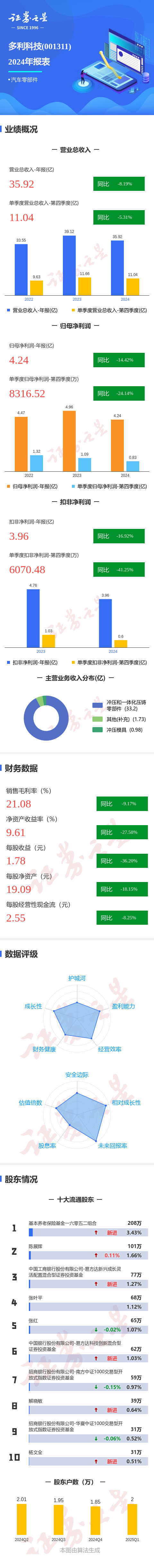 证券之星消息,多利科技2024年年报显示,公司主营收入35.92亿元,同比下降8.19%;归母净利润4.25亿元,同比下降14.43%;扣非净利润3.96亿元,同比下降16.92%;其中2024年第四季度,公司单季度主营收入11.05亿元,同比下降5.31%;单季度归母净利润8316.52万元,同比下降24.14%;单季度扣非净利润6070.48万元,同比下降41.25%;负债率22.8%,投资收益523.46万元,财务费用-1254.08万元,毛利率21.08%。